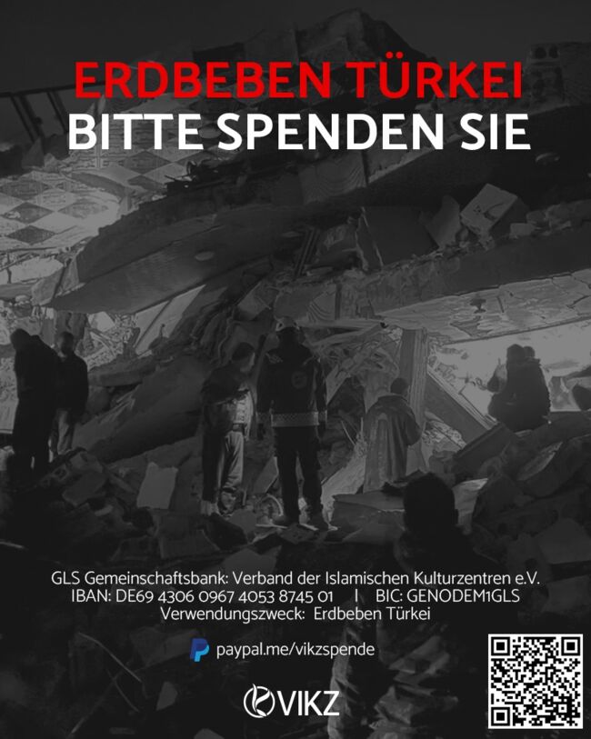 Der Verband der Islamischen Kulturzentren e.V. (VIKZ) ist tief erschüttert über die verheerenden Auswirkungen des Erdbebens im Südosten der Türkei und seinem angrenzenden Nachbarland Syrien. Der VIKZ wünscht allen Todesopfern Allahs Segen, den Hinterbliebenen sein tiefstes Mitgefühl und den Verletzten schnelle Genesung. Geşmiş olsun Türkiye! Möge Allah Te’ala die Menschen vor weiteren Katastrophen schützen.